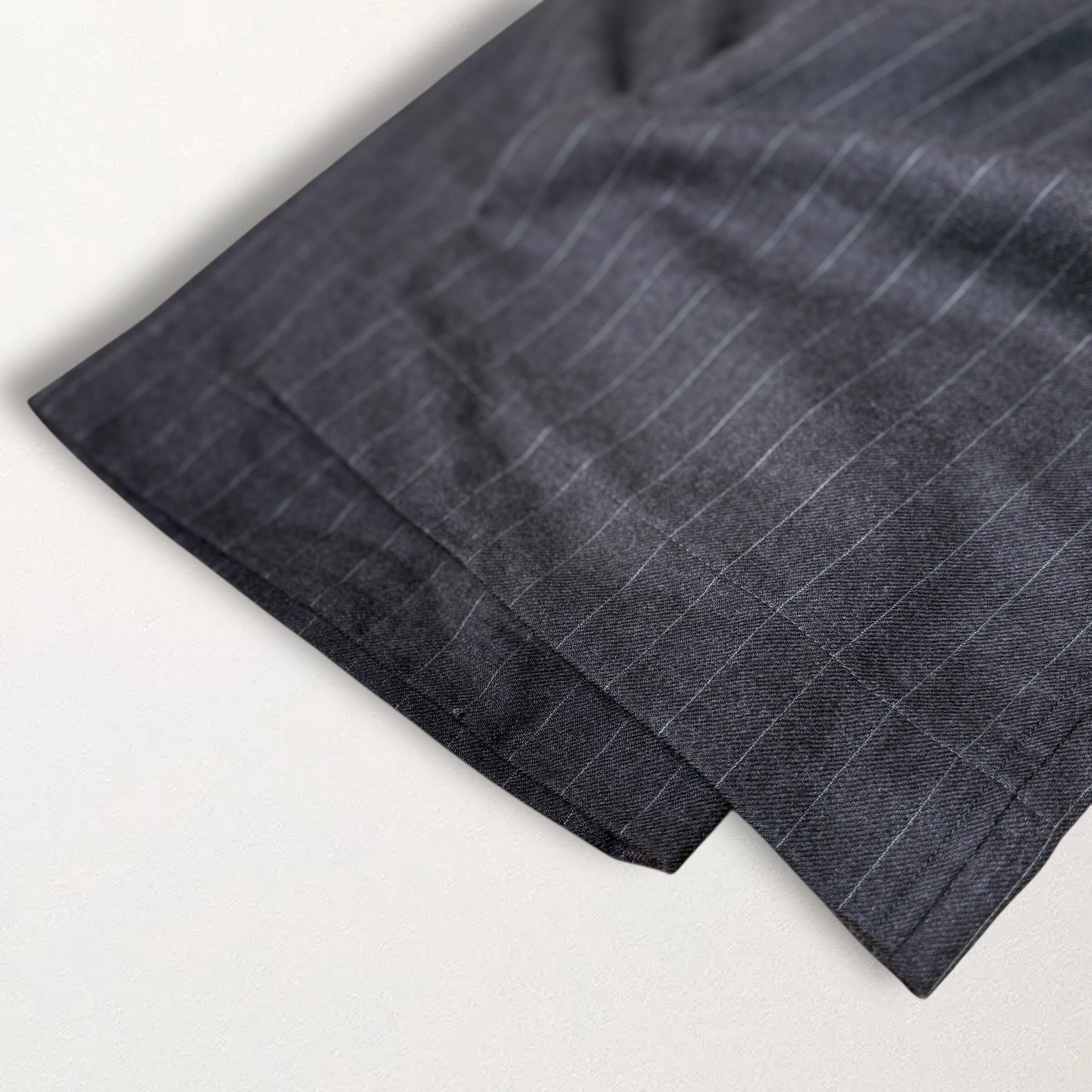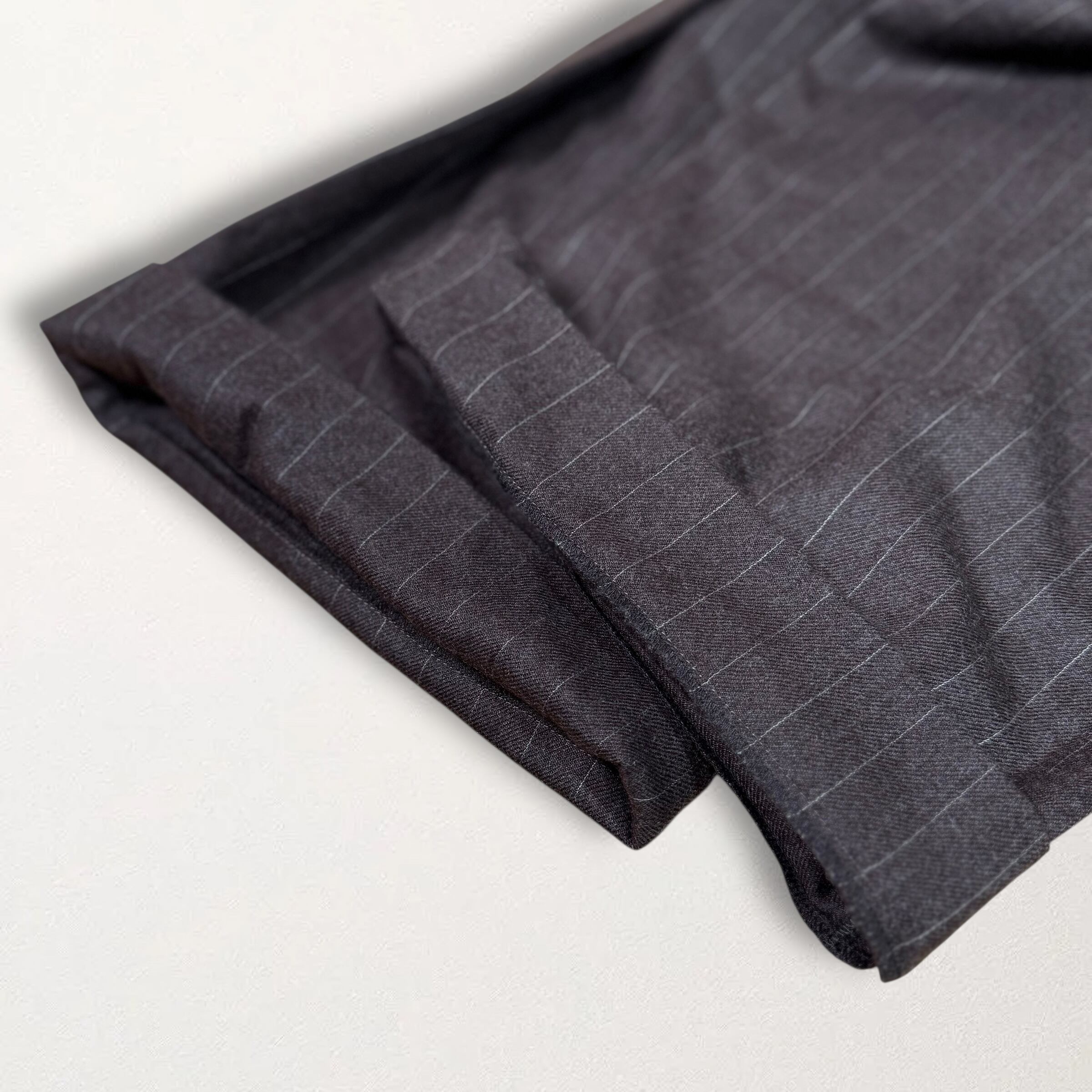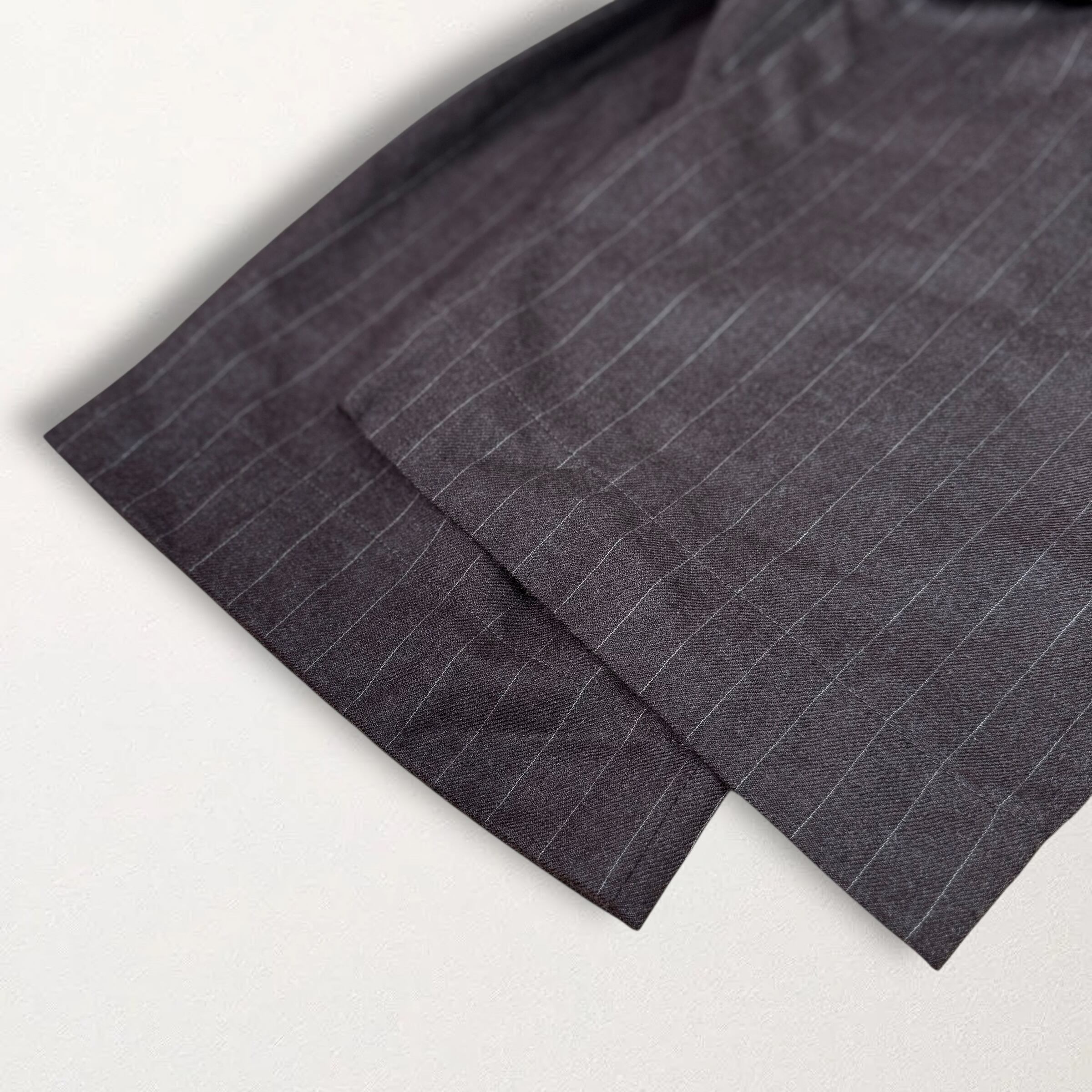 厚すぎずやや柔らかい質感のウール地、ブラウンをベースとしたペンシルストライプ柄で上品な印象です。