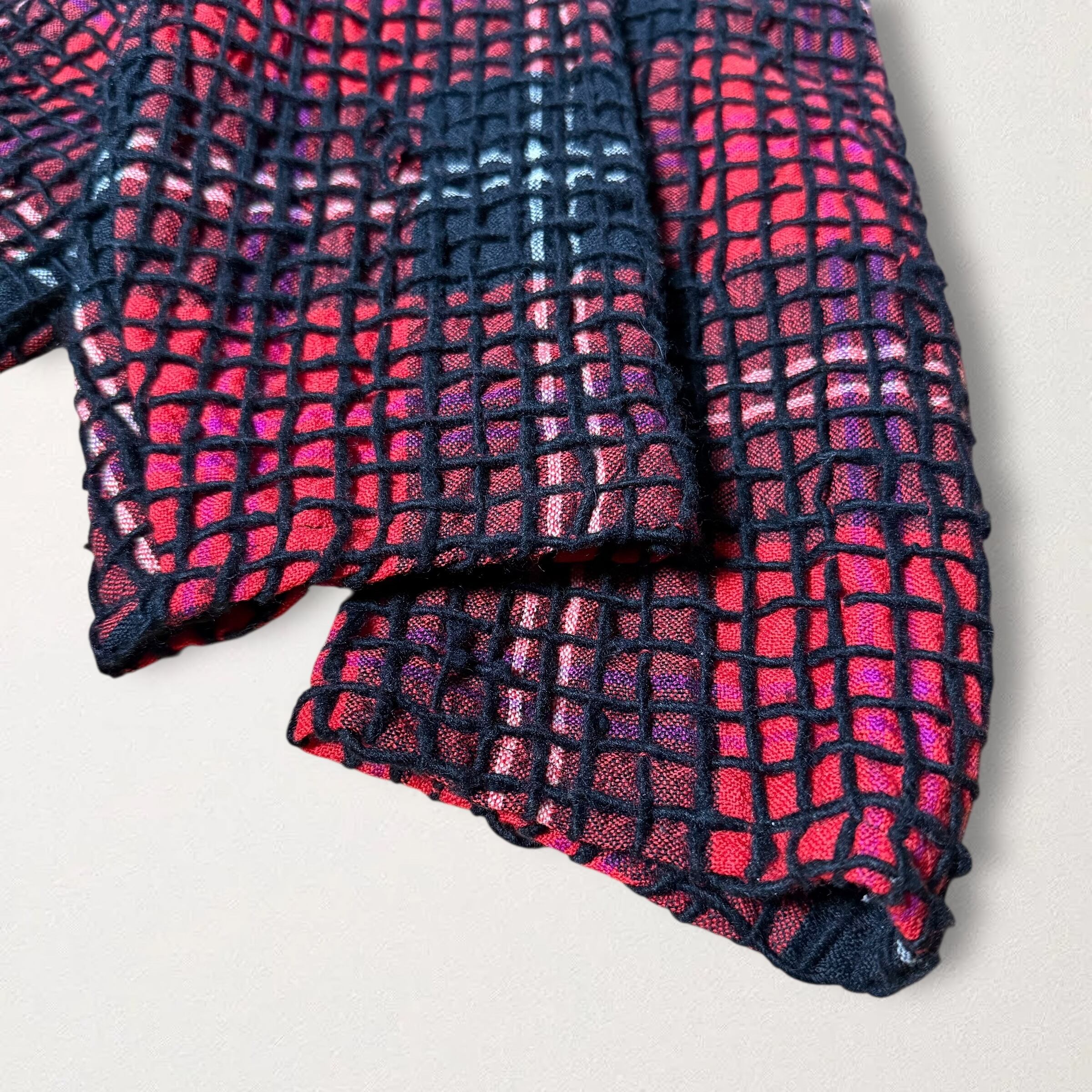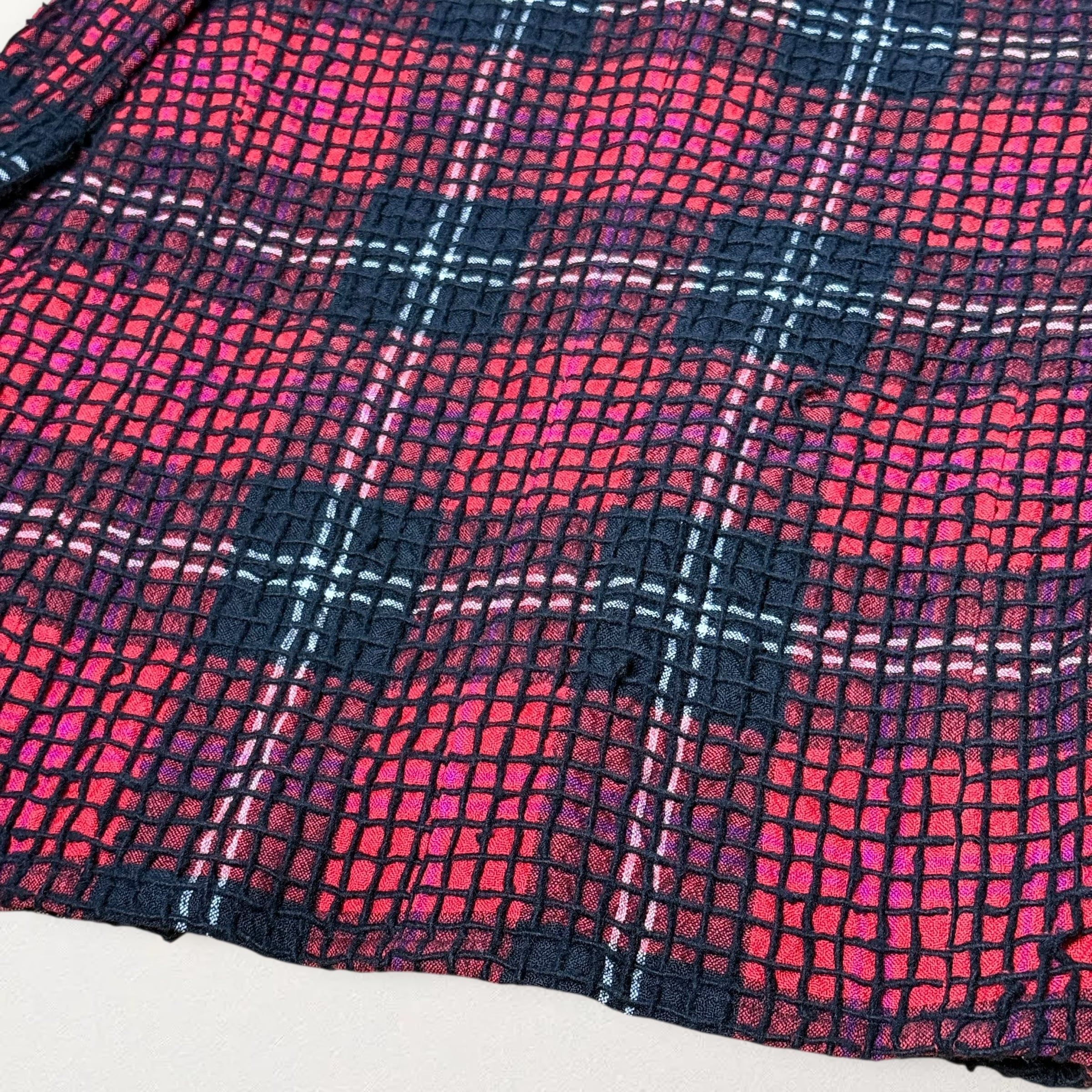 やや薄手でやや粗めに編まれたタータンチェック柄のウール地の上から起毛されたウールの太糸が網目に取り付けられたパンクな印象のジャケット